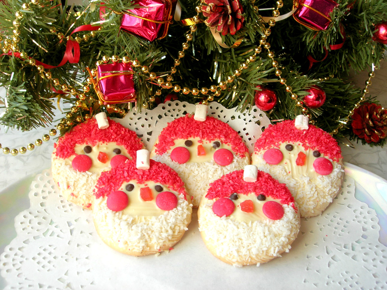 5. Украшаем бисквитное печенье в виде Деда Мороза. Можно использовать для украшения мой перечень ингредиентов, а можете придумать свой вариант.