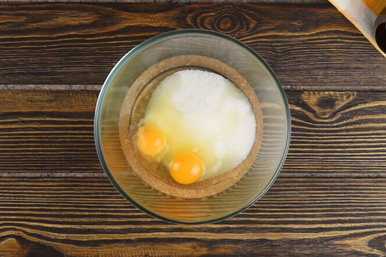 Смешаем сахар, ванильный сахар и яйца, хорошо перемешаем.
