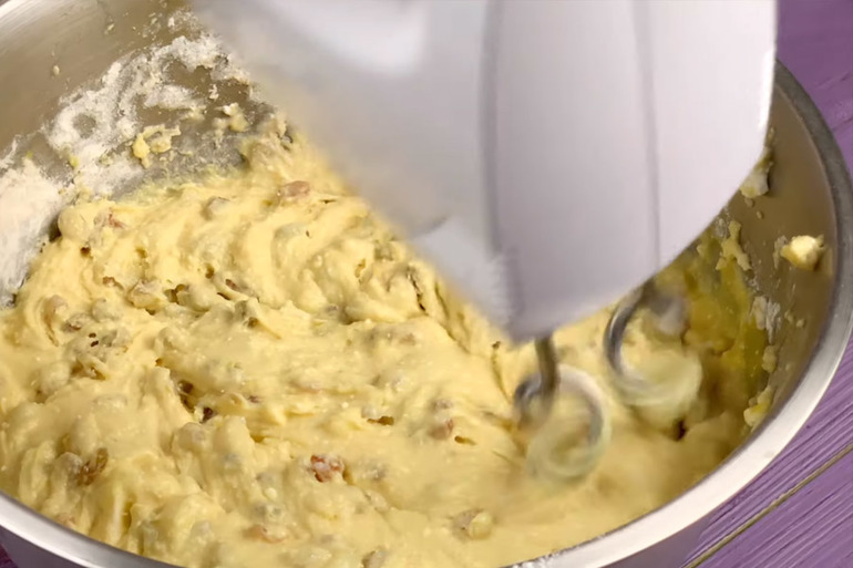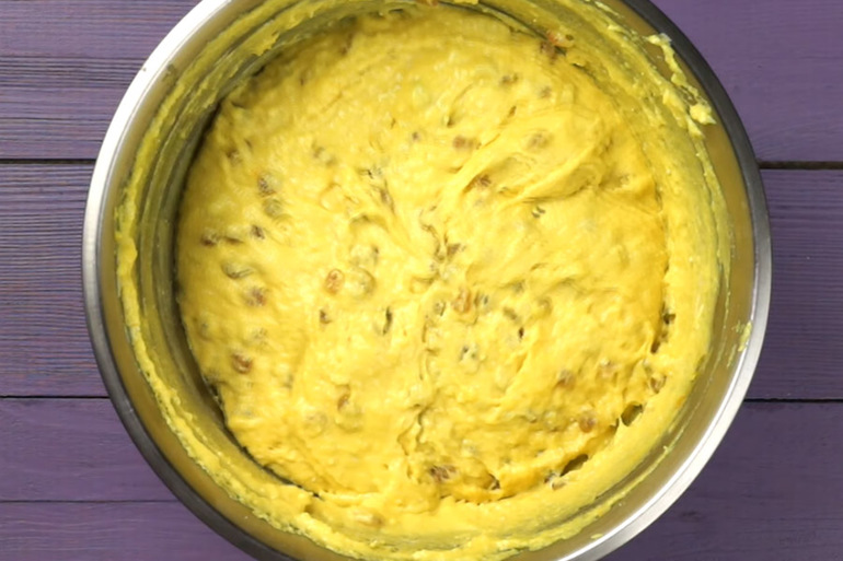 Готовим тесто. Добавляем в опару желтки, яйца, соль, ванильный сахар, разрыхлитель, куркуму, сахар, молоко, творог, масло, изюм и цедру лимона. Хорошо все перемешиваем миксером около 5 минут.