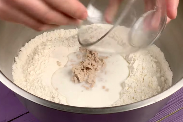 Приготовим опару. Для этого всю муку нужно просеять в миску, в ней сделать лунку, вылить 100 мл молока и добавить дрожжи и сахар. Присыпать мукой и оставить на 20 минут.