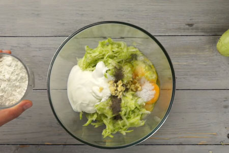 К отжатому кабачку добавьте сметану, соль, перец, чеснок и муку, все перемешайте.