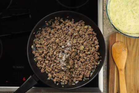 На сковороде обжарьте фарш с луком до готовности, около 10 минут. Отложите фарш в отдельную миску.