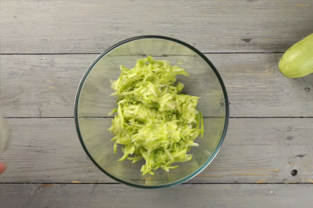 Кабачок натрите на крупной тёрке и отожмите с него сок.