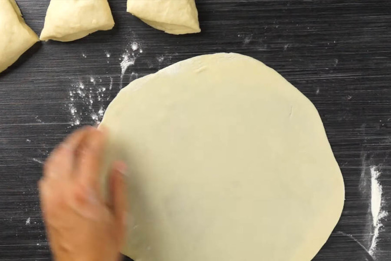Разделите тесто на 4 части, раскатайте 4 тоненьких блинчика.