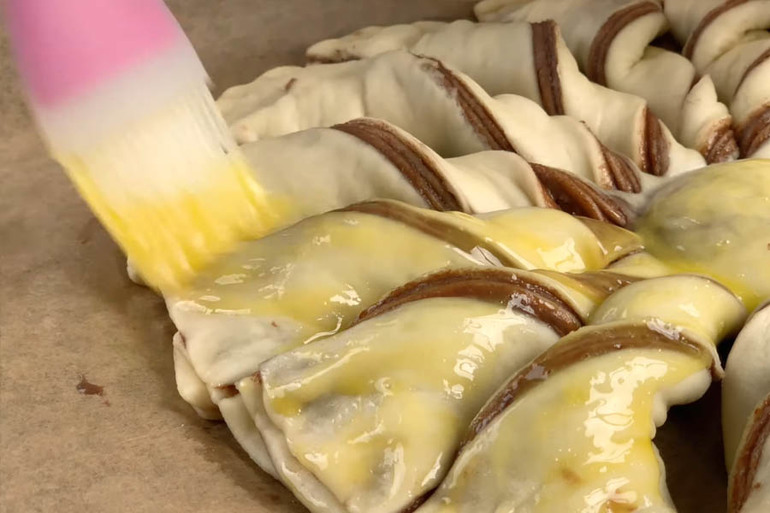В центр круга поставьте стакан - это будет ограничитель. Сделайте надрезы от стакана до края теста и закрутите кажды образовавшийся ломтик. Смажьте желтком.