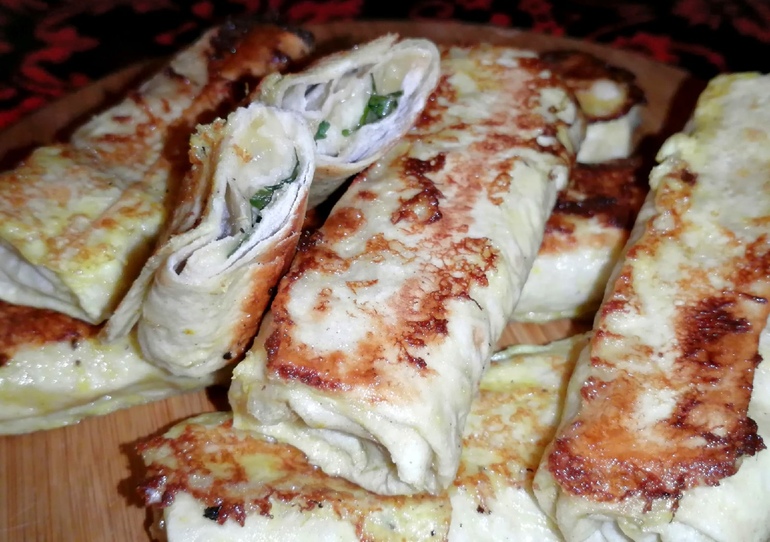 По правому краю выкладываем начинку, заворачиваем в тугие трубочки, обмакиваем в яичную массу и готовим в разогретом мультипекаре на пицца-панелях или на гриль панелях 2-3 минуты с каждой стороны.
