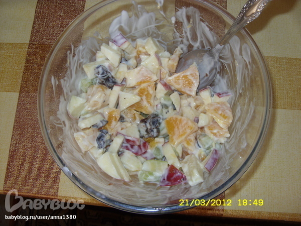 От сочетания яблоко-апельсин-чернослив-киви у меня уже желудок скручивается =) А если я буду кушать апельсин с йогуртом, то это вообще жесть для меня =) Хотя мне очень нравится такое сочетание как виноград с картофельным пюре, или сушка с маслом и сыром =) Или оладушки с аджикой =) Ужас... А чего я столько мучного-то ем? Жесть, надо заканчивать с этим делом =)