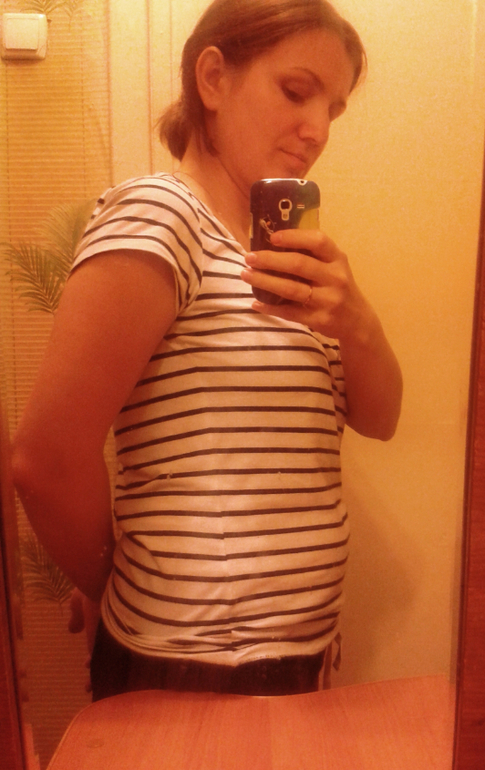 Жду анализ крови. Вес у меня пока максимум +2 кг.. Живота под одеждой не видно практически, фото только такое, в начале недели. Пора уже начинать приличные делать))) Грудь блин уже явно полная 4ка...пора бельё менять