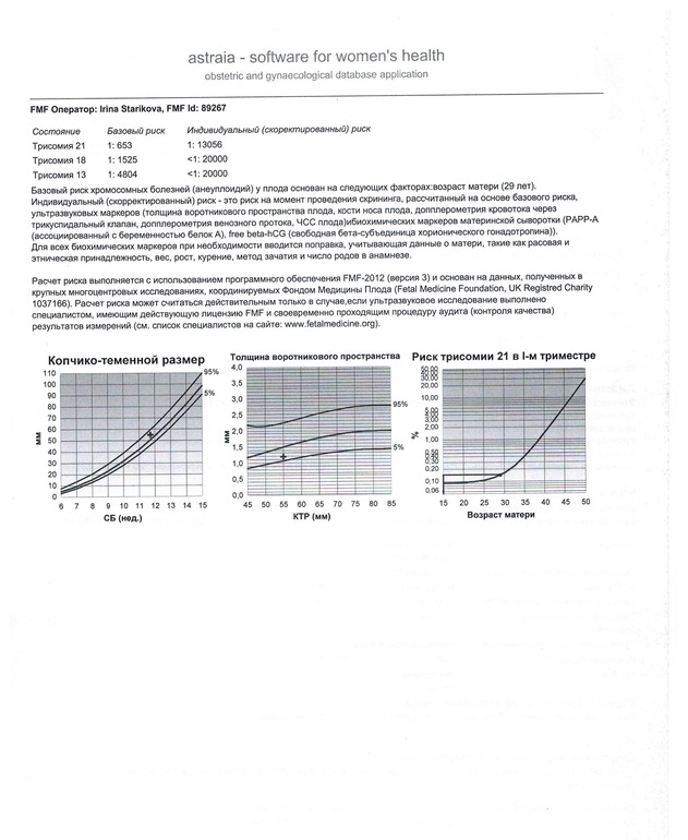 Тут имеется ввиду, по графикам, что по размерам плода, толщине воротникового пространства и вашему возрасту все абсолютно нормально а вверху столбик вероятность рождения с трисомиями, она ничтожна. Все великолепно!
