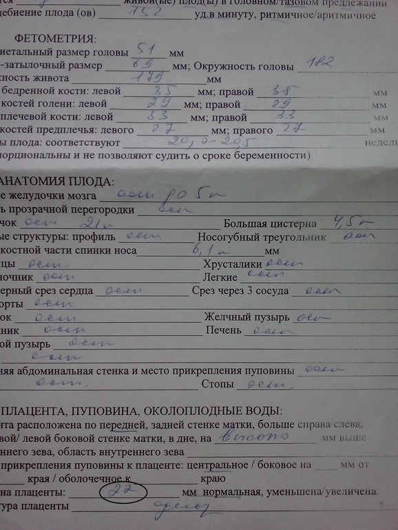Вот обведена которая цифра какая- 22 или 27? Если сравнить с другими семерками в почерке врача,то вроде 22...А если 27 мм,то это уже утолщение плаценты да? И степень зрелости поставила 0-1,хотя подчеркнула что соответствует сроку Б. Читала,что степень должна быть нулевая на этом сроке и до 32 недели. Хотя вроде пишут,что главное толщина плаценты.И на словах сказала,что все хорошо.Она эта врач не просто узист, но и акушер-гинеколог. В нашей ЖК только она и делает узи. Сразу не спросила ее,там очередь была,потом дома только внимательно все прочла. Но я все равно че-то переживаю...А как у вас было? Спасибо)