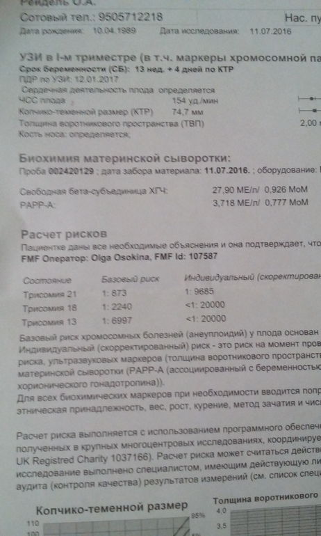 Хороший результат. Но это капец че творится с этими скринингами. Ну и что, что потерялся, он же остался в лаборатории, могли бы ваши врачи (обязаны были) связаться и запросить копию раз потеряли. Читаю тут всех, то считают через **пу, то теряют результат, то выдают высокие риски без консультации. Да они че все поели? Врачи млин.