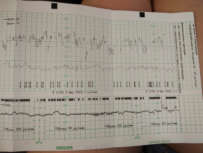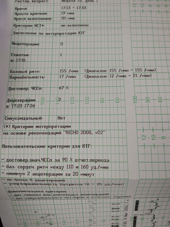 Результаты: УЗИ, КТГ, доплера, скринингаВсем здравствуйте. Срок у меня 33 недели и 1 день, сегодня была на первой КТГ и сразу всё пошло не так - мне намерили ЧСС ребёнка 106 и с этим и протоколом КТГ, где одни знаки вопроса, спокойно отпустили. Но я-то помню, что у ребёнка минимум 140 должна быть ЧСС, обратилась со своими подозрениями в регистратуру ЖК, где мне подтвердили что намерили мне какую-то фигню, а точнее мои сердечные сокращения, и отправили переделывать (дама, которая делала мне КТГ, по-ходу вообще не в курсе, какой сердечный ритм должен быть у ребёнка). Прошу у вас помощи в расшифровке этой повторной КТГ, так как с ней как будто бы тоже не всё гладко (акселераций 0, а делераций 2, сердцебиение терялось периодически ). Завтра иду с этой КТГ на плановый приём. Ещё на последнем УЗИ 2 недели назад мне поставили нетугое однократное обвитие (допплер не делали) и сказали сделать ещё раз УЗИ поближе к родам, неделе на 37, а про обвитие даже в протоколе ничего не написали. Я вот сижу и голову ломаю, страдает ли мой ребёнок, или всё хорошо, нужно ли мне бежать на платный допплер и УЗИ сразу после завтрашнего похода к врачу, или правда подождать 37 недели, потому что даже врачам нельзя доверять, как я вижу( Детка двигается как обычно.