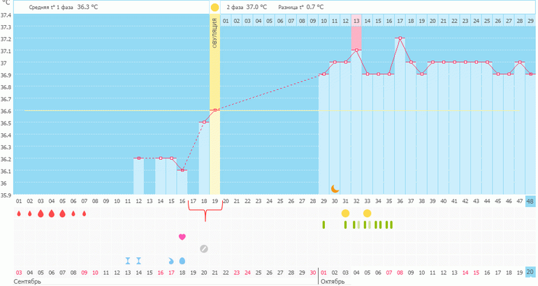 Анализы, инфекцииУ меня овуляция позже, чем на 14 ДЦ, обычно. В беременный цикл график БТ вела чёрти как, особо то не планировали. В итоге вариант овуляции - аж 3 дня:17,18, 19 ДЦ.