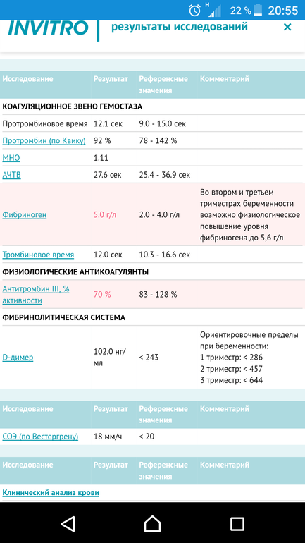 Фибриноген для срока высокий. Антитромбин низкий. И будет падать. Есть мутации. Не гуд. Нехватку антитромбина компенсирует только НМГ. Клексан или аналоги надо колоть. Причем на клексане антитромбин уже можно не сдавать. Клексан вместо него работает. Фибриноген попробуйте омегой снизить (дневная доза не менее 1000 нужна лучше в триглицеридах). Некоторым помогает. Мне помогало удерживать его в разумных пределах только клекспн+кардиомагнил. С фибриногеном 6.5 идут в роды. Больше 7 опасно тромбозами. Рфмк надо сдать и протеин Си S и их активность. Если последние тоже низкие, то клексан надо колоть срочно.