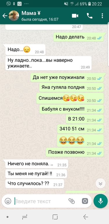 Проснулась утром 5 числа в 8 утра.Выспавшаяся,всё вроде замечательно.Пошла в туалет,вернулась назад с мокрым трусами.Поменяла белье и на всякий пожарный поставила прокладку,легла снова.У самой в голове появился червячок,а вдруг это они....роды))))Проснулась дочка,мне пришлось встать вновь и идти готовить завтрак,воды опять стали подтекать,но совсем немного,мы позавтракали,дочь ушла в театралку,муж с самого утра был на даче.У меня же тем временем потихоньку начал схватывать живот раз в 10-20 мин.Я стала перебирать пакет,постирала костюм дочери для выступления,приготовила пакет с вещами на выписку.Водичка так же периодически подтекала, но маленькими дозами по пол чайной ложке.Решила в 12 позвонить мужу.Сказала что возможно у меня подтекают воды и нужно доехать в роддом.В 3 часа мы были в приемном покое.Ктг показало что у меня идут схватки(как назвала их акушерка "волнушки"),врач посмотрела меня на кресле,глаза у ее нужно было видеть,она не смогла найти мою удивительную шм.Я ей объяснила что и как.Водичка ни при осмотре ни после больше не подтекала.Амниотест был отрицательный.Мне предложили остаться и лечь в патологию,но я отказалась и мы уехали домой.Врач проводила меня со словами,если что усилится не медлить и возвращаться,а то с моей ИЦН это опасно вероятностью родить дома или в дороге.Мы уехали,дома состояние было таким же,муж поужинал и спросил меняется ли что у меня?А у меня на какой то момент были схватки с интервалом 5 мин и длительностью 20-30сек.но они были ласковыми,легкими,совершенно спокойно я лежала и смотрела ленту в бб.Какое то чутье мне подсказывает собираться и ехать назад в роддом.В 19:00 мы были вновь в приемном,на оформление бумаг ушло 30 мин.В 19:40 я была в родзале,поставили КТГ.Пока лежала схватки стали реже,мелькнула мысль что я здесь на долго.В 20:20 пришла доктор посмотрела и сказала,т.к. беременность не переношеная ждем что всё произойдет само собой,в другом случае я б вам развела плодные оболочки и мы бы в течении 2ч!!!! Родили)))))у меня эти слова до сих пор в голове.Мне после разрешили освоиться в родзале,включить телевизор,примериться к мячу,приготовить детские вещи.Я сходила в туалет,приготовила вещи,заглянула к вам на бб и сделала несколько фото.Села примериться на мяч.В это время написала мама в Ватсап приложу скрин нашей переписки,обратите внимание на время сообщений !!!!