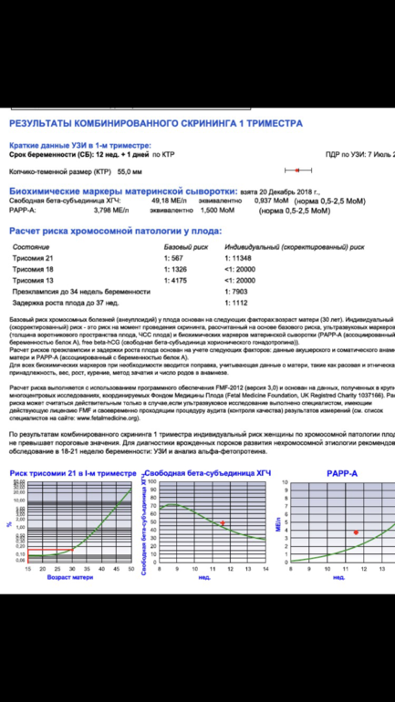 Второй и третий график это усредненные кривые по показателям крови (бета-ХГЧ и РАРР-А) в зависимости от срока беременности. Ваши значения в пределах нормы, см. п. "Биохимические маркеры материнской сыворотки".