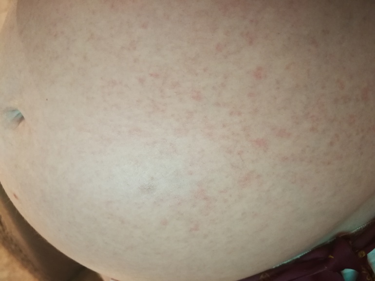 Пришла вечером с прогулки и обнаружила, что весь живот (только он), весь в сыпи, что это может быть. Зуда нет. Кто с таким сталкивался? Может чем - нибудь намазать?