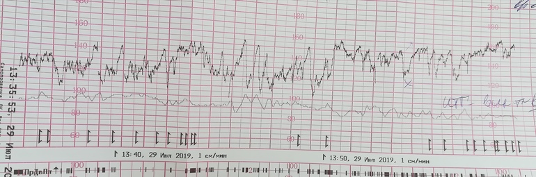 Результаты: УЗИ, КТГ, доплера, скринингаДевочки, здравствуйте! Кто разбирается в ктг, посмотрите пожалуйста. Аппарат у нас старый, баллы не ставит. Заключение врача - ктг вариант нормы. А меня смущают падения до 100,да и вообще первая часть графика. Действительно ли ктг нормальное?
