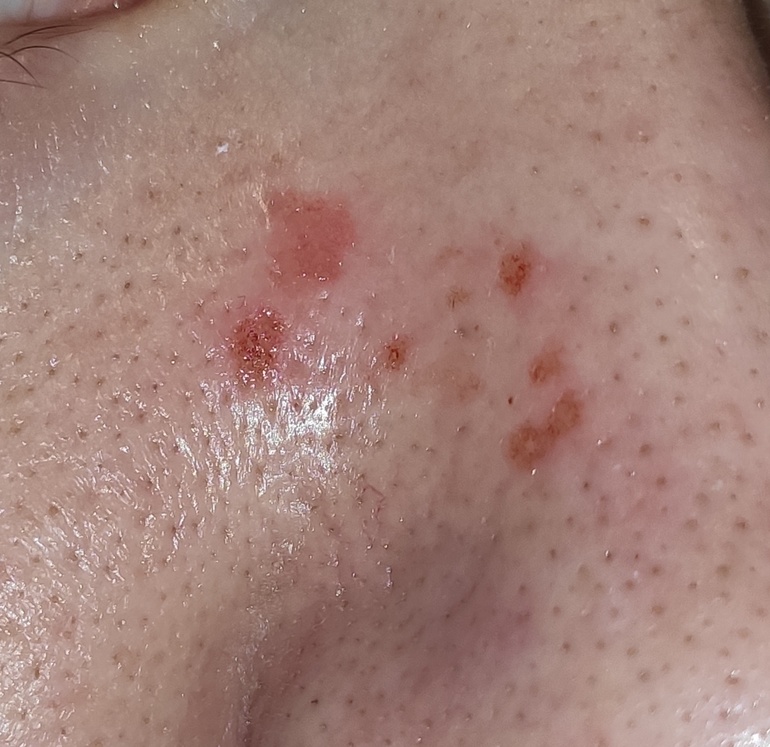 Сегодня с утра вообще безобразно лицо выглядит, весь нос практически в таких корках, они бордовые, как кровь запекшаяся... И ещё по линии роста волос на виске и на мочке уха две ранки.. Врач говорит, не надо было вчера купаться и мыть голову, из-за того, что я намочила всё это безобразие, оно и начало разрастаться.