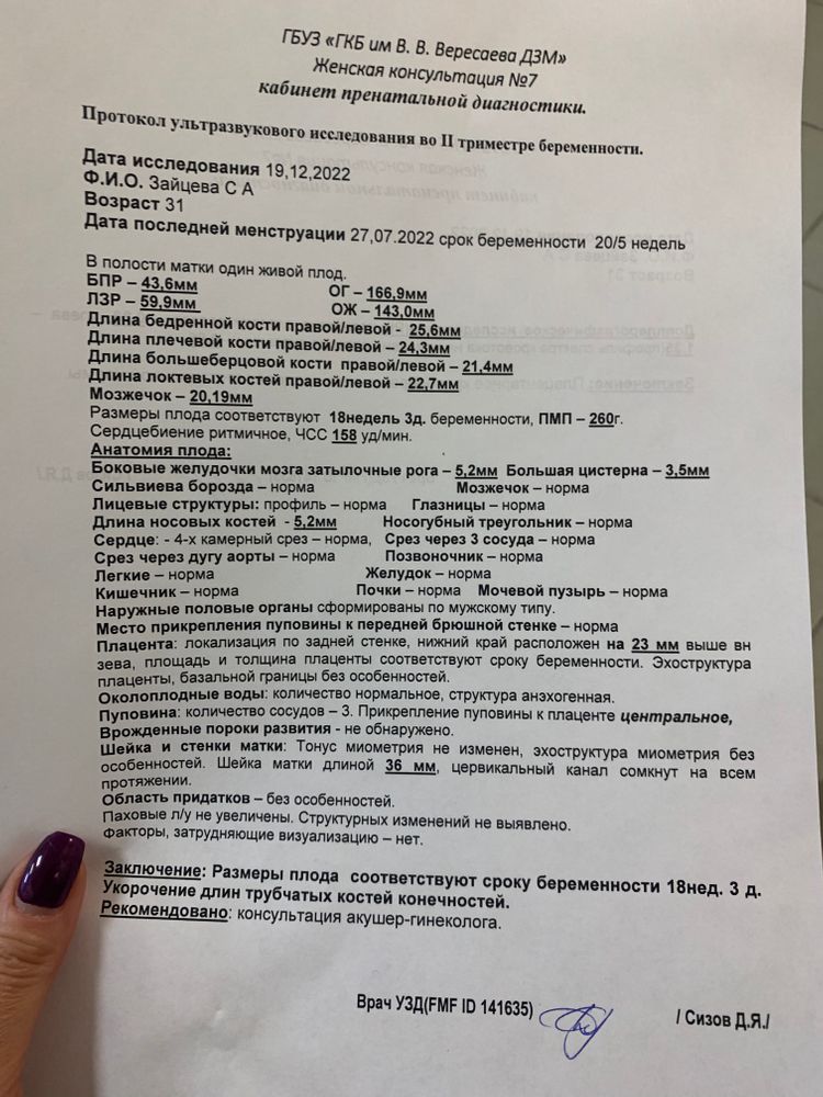 16.02 Узи Воеводина С.М. Узи с целью отслеживания динамики роста плода. Мне сняли подозрение на отставание, укорочение на 100%. В заключении написано, что анатомически плод развит правильно. Пороки развития, генетические и хромосомные заболевания на момент исследования не выявлены.