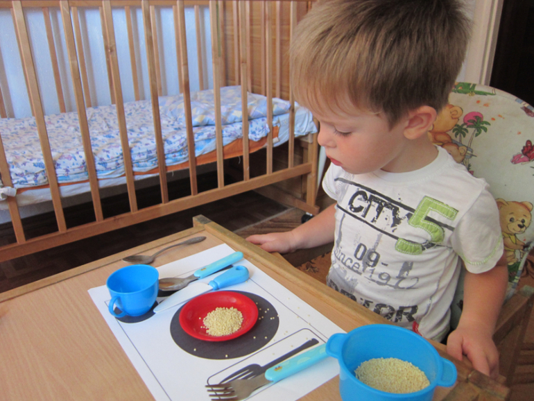 Покупали, теперь нужно накормить! Максимка сварил кашу, разложил приборы и покормил Чуню с ложечки))