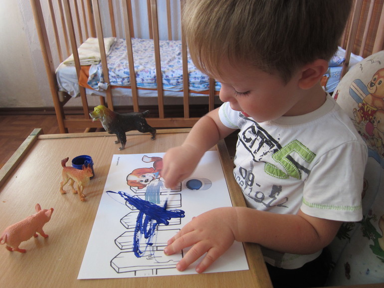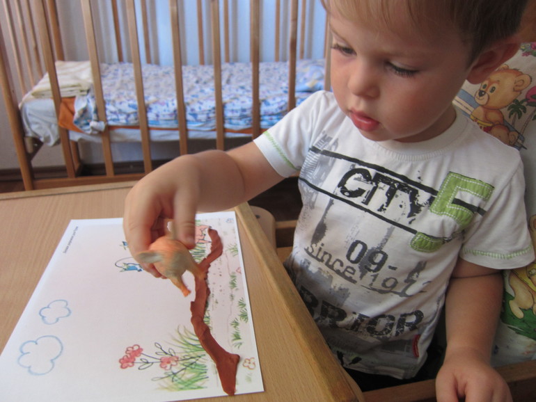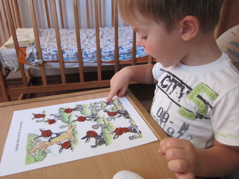 Следующим нам встретился кролик! А Максим получил новое задание - найти на картинке всех зайчиков! Для верности решили их залеплять пластилином)