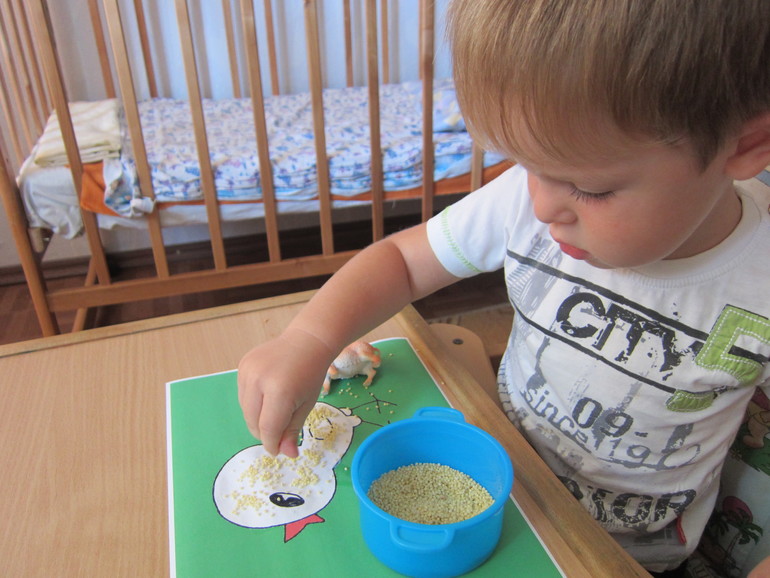 Первым нам встретился цыпленок, мы разыграли сценку из мультика и выполнили задание, разукрасили цыпленка пшеном!
