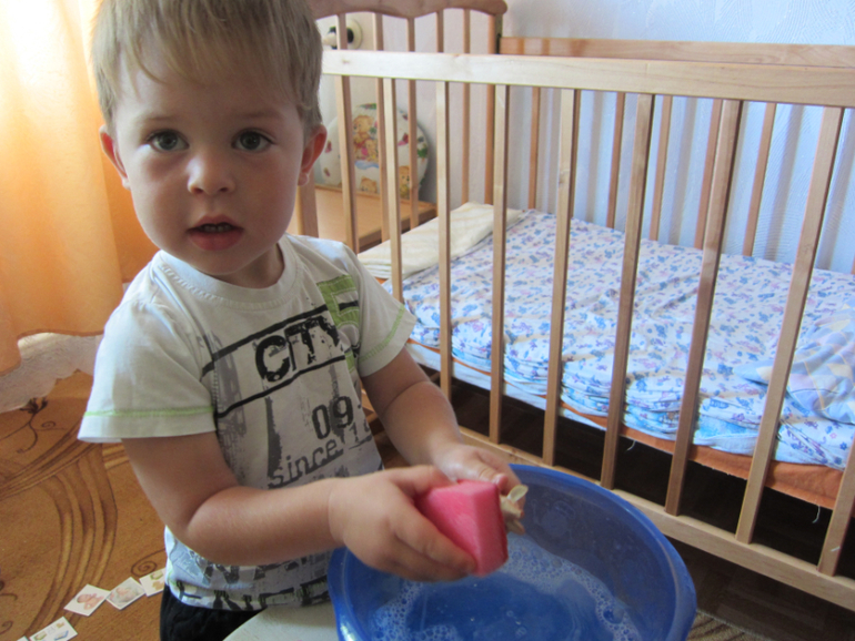 Начали собирать последовательность действий для купания! Куклу Макс купать отказался, поэтому мы купали поросенка!