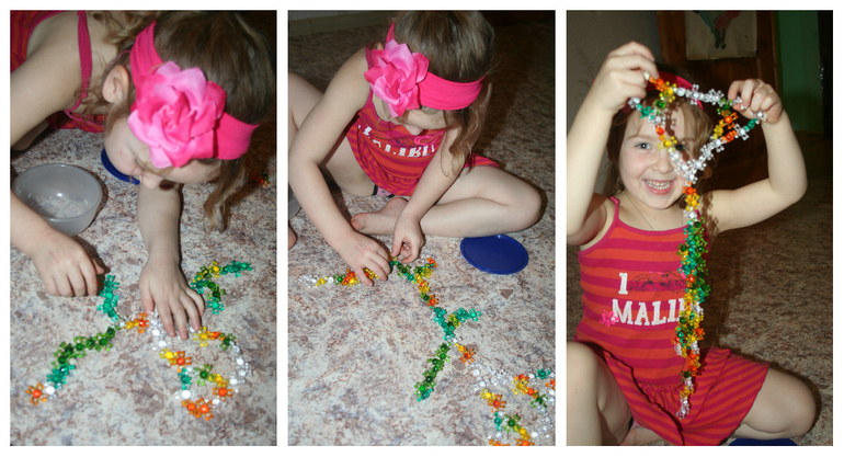 Пока Камилка раскрашивала я много болтала на английском про цвета, выспрашивала ее любимый цвет, рассказывала, какие предметы у нас в комнате какого цвета, какие в природе, в общем, не теряла времени зря :-) И не знаю толи поэтому, толи просто обезьянки понравились, но Камилла побежала за цветным конструктором и сказала, что будет делать из него "monkey" :-) Получилась очень веселая и довольна крепкая подружка, с которой тут же были устроены танцы :-)
