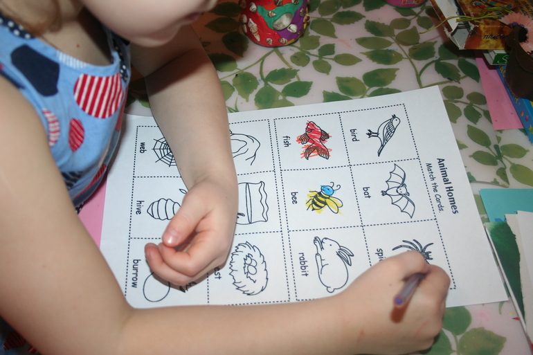 Затем перешли за стол и с помощью уже полюбившейся нам цветовой лотереи раскрасили новых для нас животных и насекомых. А так же быстро нашли нужные домики и узнали их названия. Цвета Камилка почти все уже знает, меня это очень радует и наталкивает на придумывание новых игр в цвета.