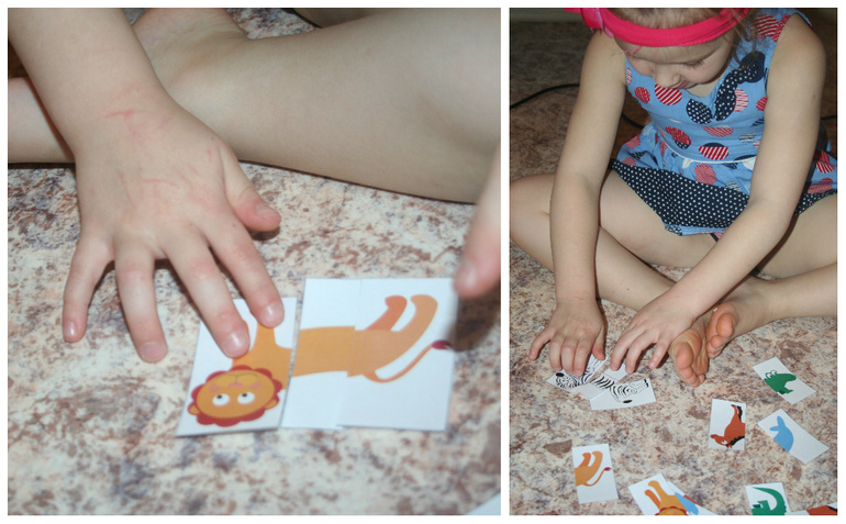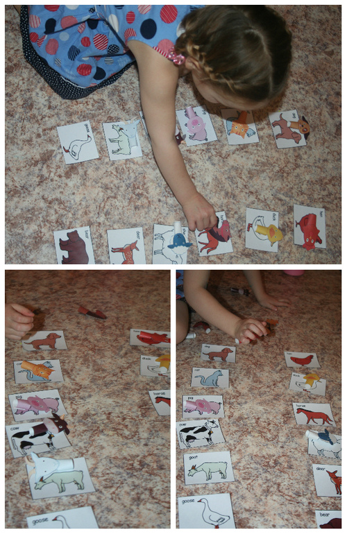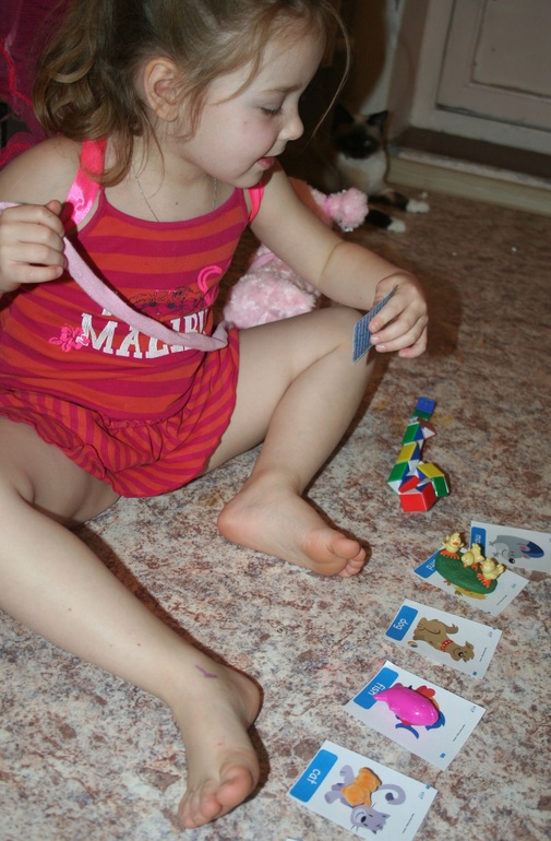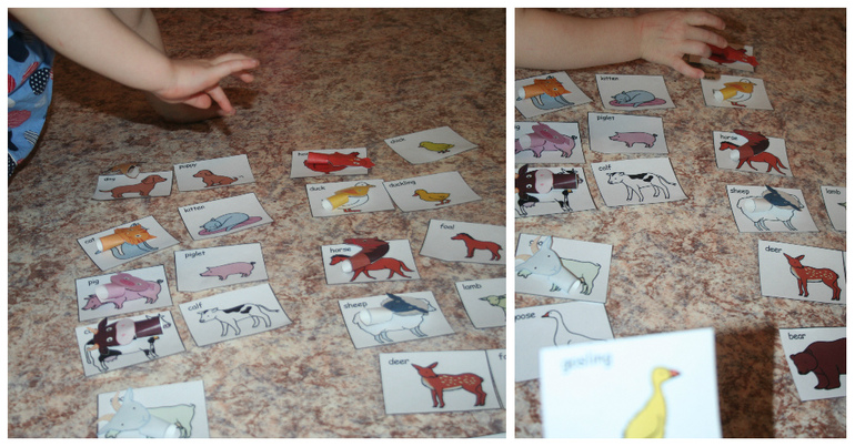 После сортировки карточек мы, наконец, перешли к детенышам. Честно говоря, я сама не знала большую часть названий, поэтому было вдвойне интереснее. Играли мы так: я плаксивым голосом рассказывала, кто я, и что я потерялась и просила найти мою маму, а Камилка искала маму и говорила, как ее зовут. Например так: "Hello! I am a piglet and I was lost. I am looking for my mother. Do you know where she is?"