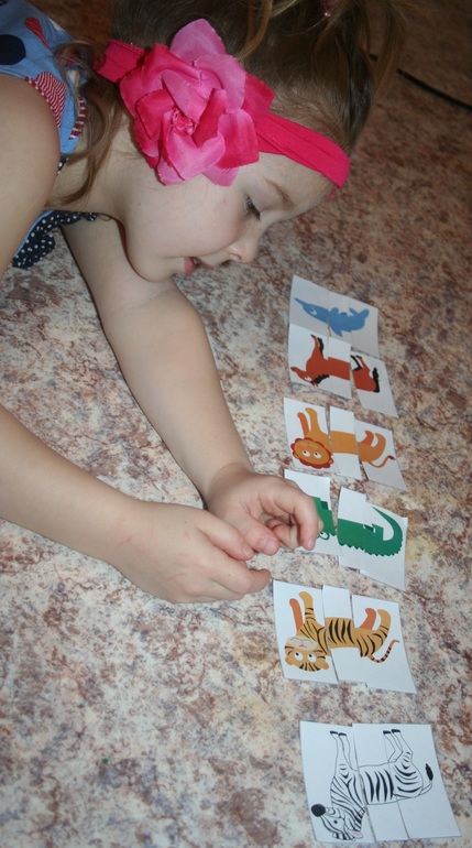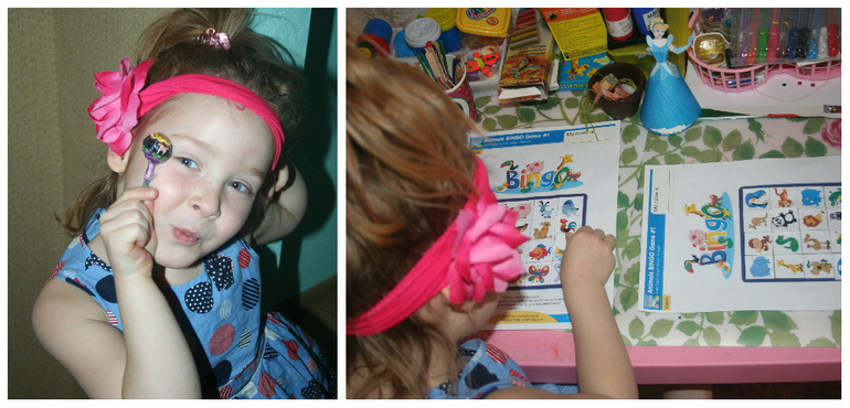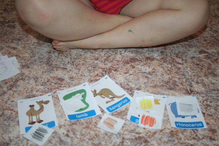 Последней стала игра в цвета. Я быстренько сделала картинки с цветами, которые Камилка использовала для раскрашивания животных, и мы поиграли в что-то типа лото. Я показывала и называла цвет, а Камилла называла животных, шерсть которых имеет этот оттенок. Потом мы поменялись, и Камилла называла цвет, а я животных.