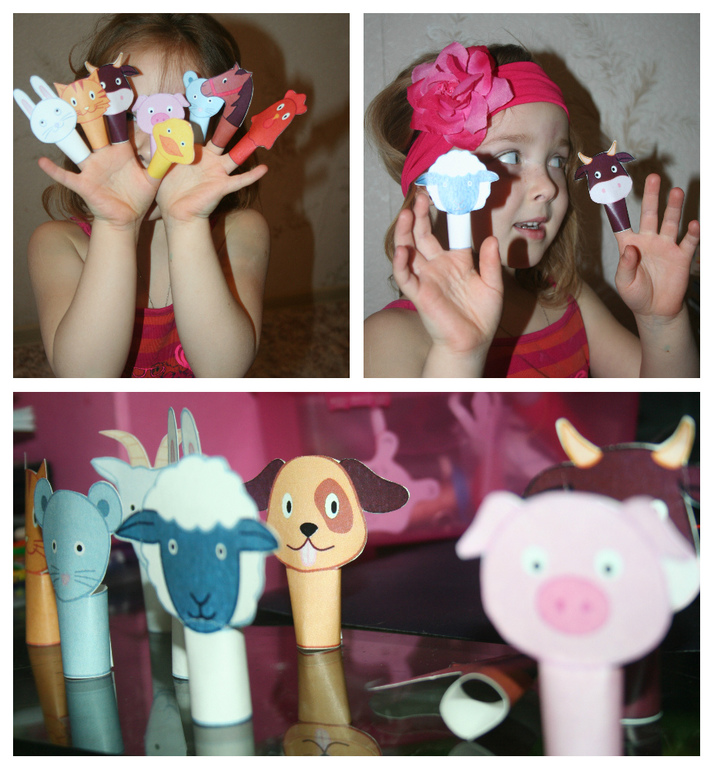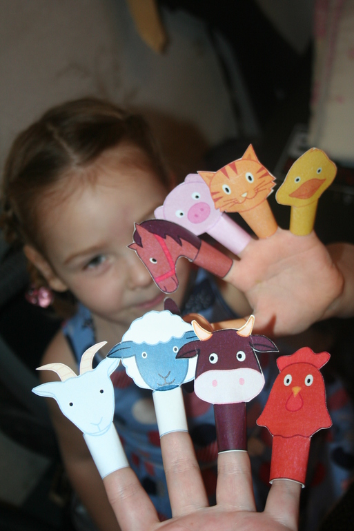 Сначала я разложила на полу все карточки "мамы", а Камилка называла животных и подбирала пальчиковые куклы. Я с большой гордостью отметила, что она знает по-английски практически всех животных, из тех что повторялись часто: a horse, a cat, a dog, a mouse, a pig, a sheep, a duck, a chiken, а из диких практически все, чье звучание похоже на наше, вроде, a kangaroo and a penguin, ну, еще a monkey and a snake. Над остальными надо еще работать, хорошо, что это можно делать так весело :-)