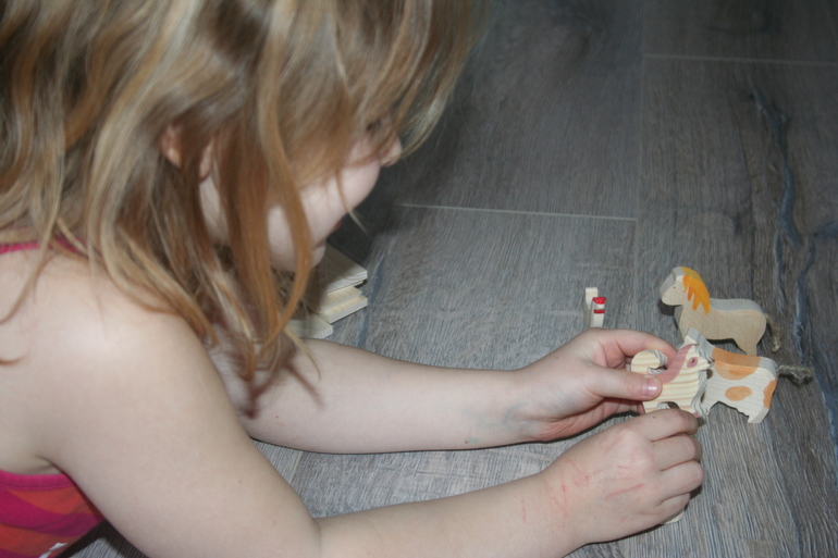 Я очень хотела, чтобы мы поиграли в квартирный поиск и нашли для каждого пальчикого персонажа еще и реальный игрушечный прототип, но видя не боевое настроение Камилки не стала затягивать игру, и мы достали нашу деревянную ферму, где как раз были основные животные: a cow, a horse, a hen, a cock, a duck, a dog, a sheep, a pig. И мы поиграли с ними в поход в гости по принципу снежного кома. Сначала шли к одному животному, потом уже вместе с ним (вдвоем) к третьему, затем троем к четвертому и т.д. И каждый раз представлялись по английски, это Камилка давно умеет. "Hello! I am Kamilla!" - в числе любимых фраз, поэтому перефразировать на лошадь, свинью или курицу не составила труда, но вот все-таки с запоминанием некоторых животных возникли проблемы, она слышит слово и тут же забывает, но надеюсь, со временем такое будет происходить все реже.