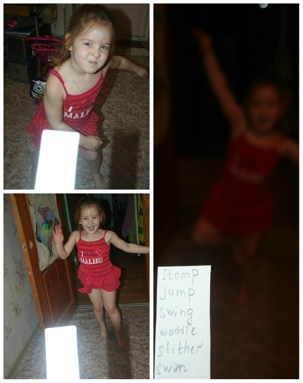 ...и напоследок еще поиграли в подвижную игру: я называла по-английски слова действий: slither, swing, dance и т.д., а Камилка показывала эти действия и называла, того, кто их делает.