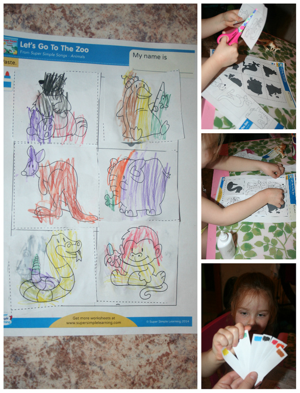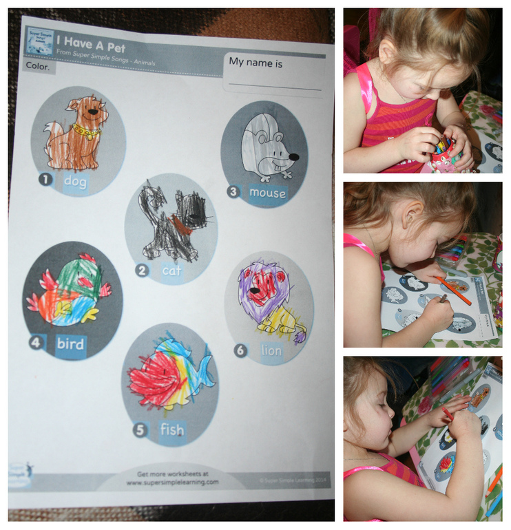 Набесившись приступили к печатным заданиям и начали по классике с раскрашивания, опять же проговаривая названия животных и цвета.