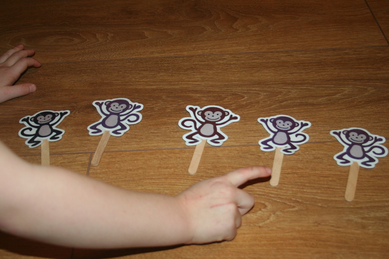 Начали мы наше занятие со знакомства с новыми друзьями - обезьянками на палочках :-) Затем просмотрели все три видео-ролика, громко подпевая и жестоко расправляясь с обезьянками после каждого "bumped his head" :-) Хорошо, что я их распечатала на картоне и заламенировала, знала, что им придется нелегко :-)