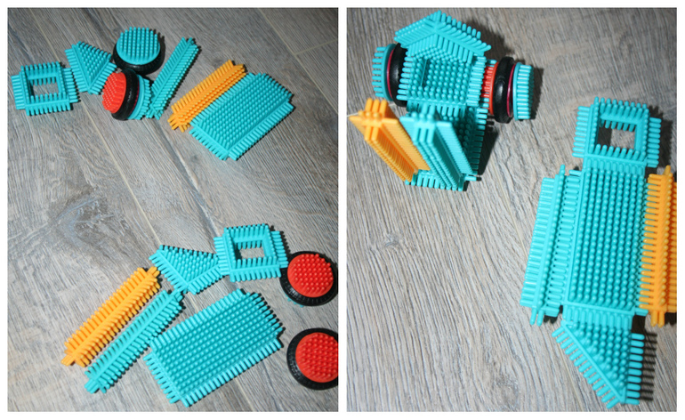 На вариант с транспортом я уже натолкнула, и мы решили построить каждый по тележке в помощь зайцу. Строили из одинакового набора деталек, а получилось по-разному (моя выше, Камина ниже).