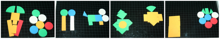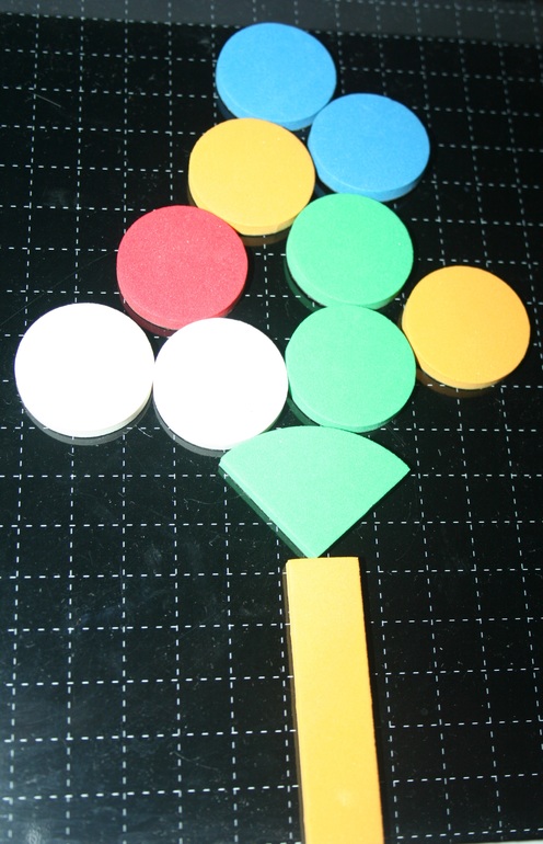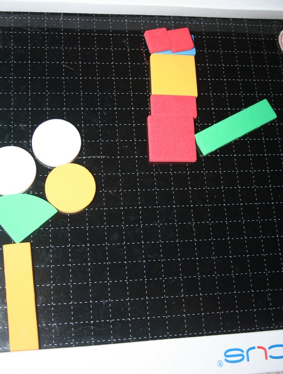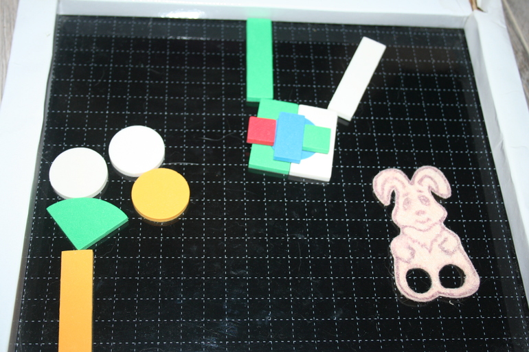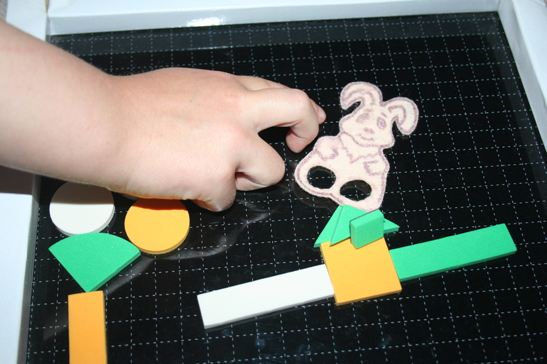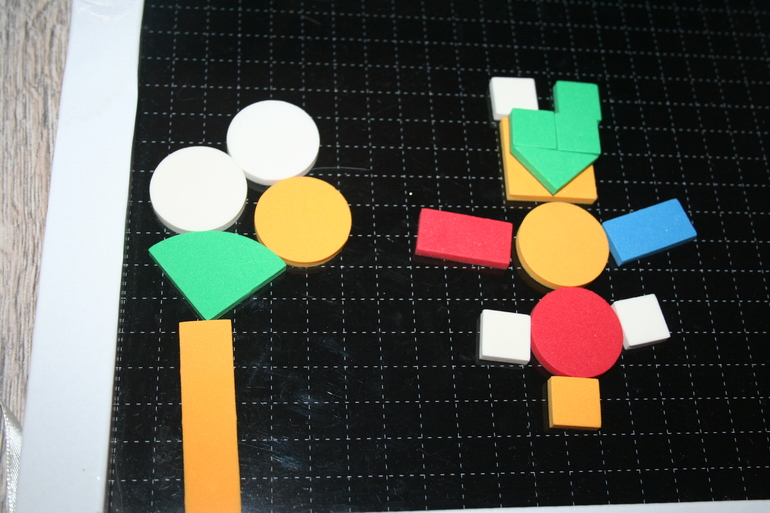 Разыграть сказку в цвете я предложила с помощью кубиков Лего, но Камилка не захотела и пошла за своим любимым геометрическим конструктором. И очень быстро сотворила яблоню...