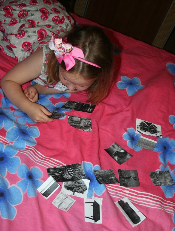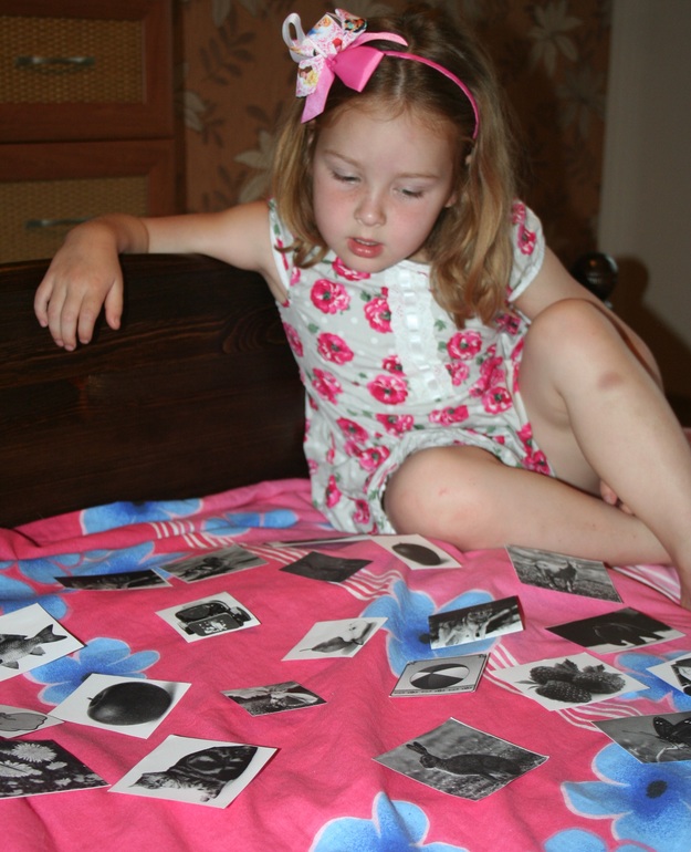 Начали мы по уже сложившейся традиции с игры с картинками, только в этот раз у нас были не загадки, а уже "да-нетки". Играть в эту достаточно сложную игру в таком формате нам очень понравилось, хотя мы уже как-то практиковали подобный вариант в дороге на рекламном проспекте, то там объектов было меньше.