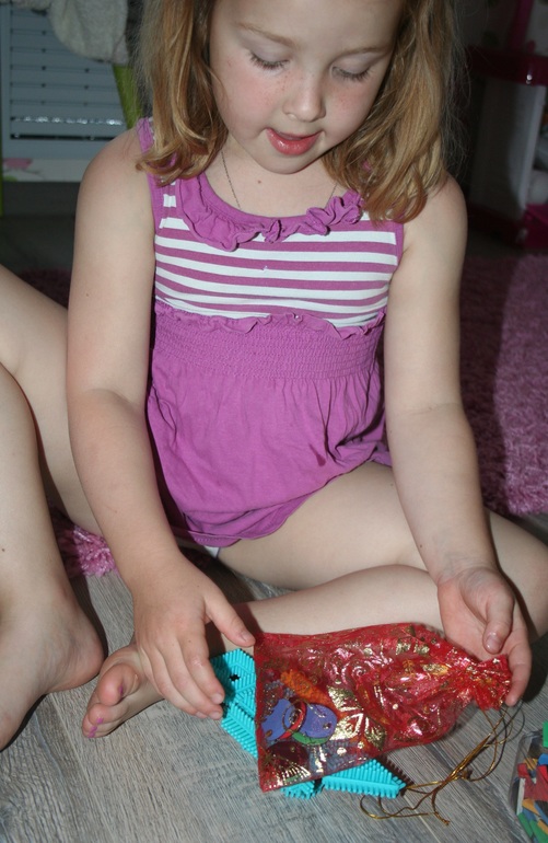 Последними встретили козу, которая попросила найти в комнате три круглых предметы, три блестящих, три деревянных, три мягких, три острых и т.п. Так играть мы любим, еле снова на сказку переключились :-)