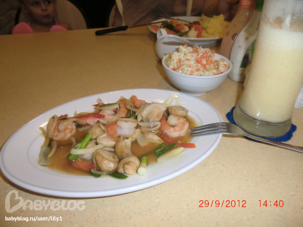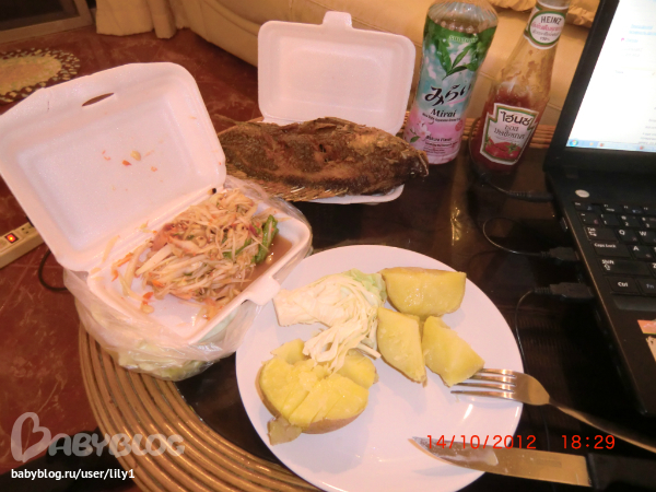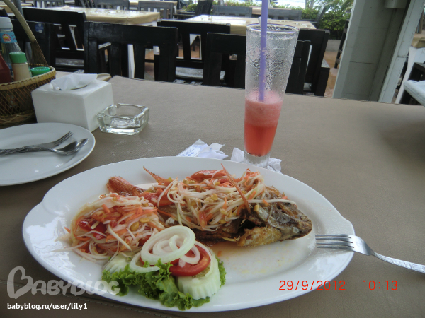 Некоторая еда бывает островатой, например салат из папаий, сколько раз говорю "No spicy" "Май Пет", показываю живот, говорю, что 33 недели, улыбаются, "no problem", я с уверенностью, что все ок, иду к себе в студию, пробую и все пипец, рот горит))) теперь делаю по-хитрому, прямо там пробую и если слишком острый, то начинаю махать рукой и просить воды)) срабатывает, теперь ступка, кажды раз моется и протирается от предыдущего острого салата)