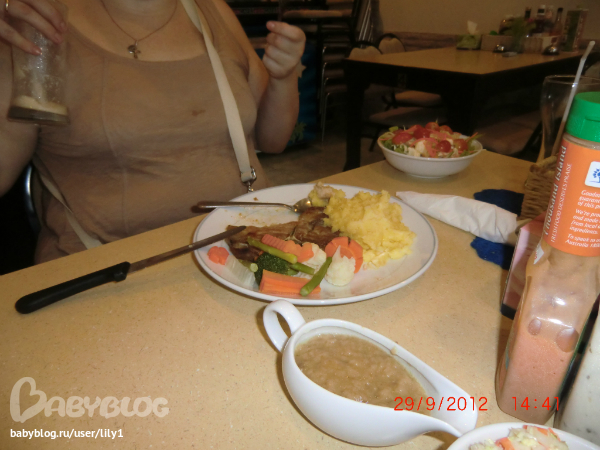 Пюрешка со свининой и овощами с непонятным соусом :)