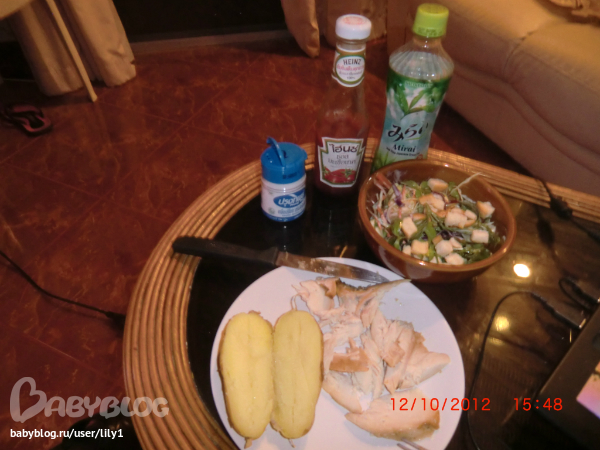 Салат "Цезарь", картошка запеченная в микроволновке и курица в сладком соусе