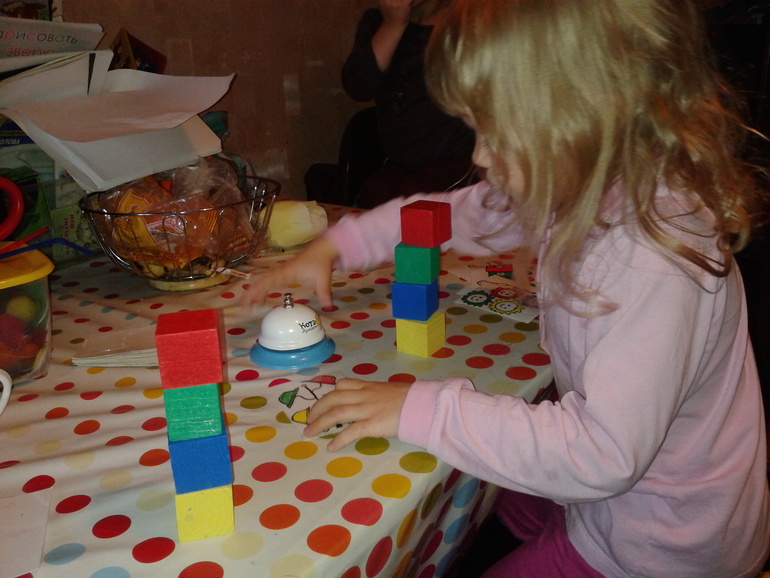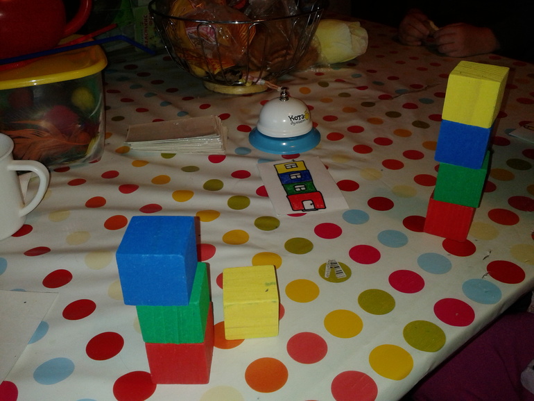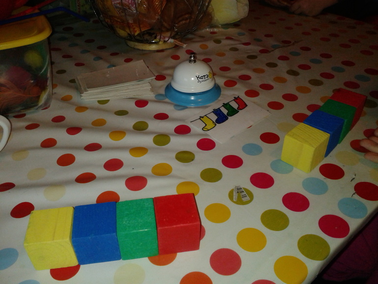 Кубики от детского конструктора, карточки рисовала сама, звоночек куплен СП закупке.
