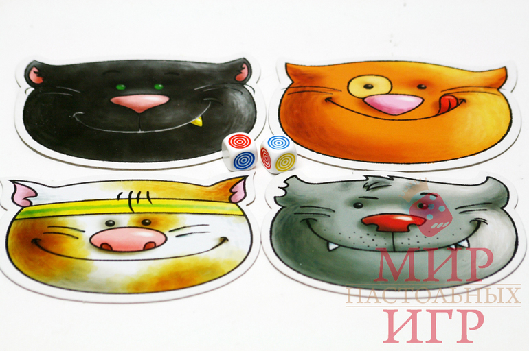 В маленькой коробочке 4 двухсторонних мордочки кошек, 30 мышек и 2 цветных кубика. Все очень высокого качества. мордочки из плотного картона, но покрыты пленкой.