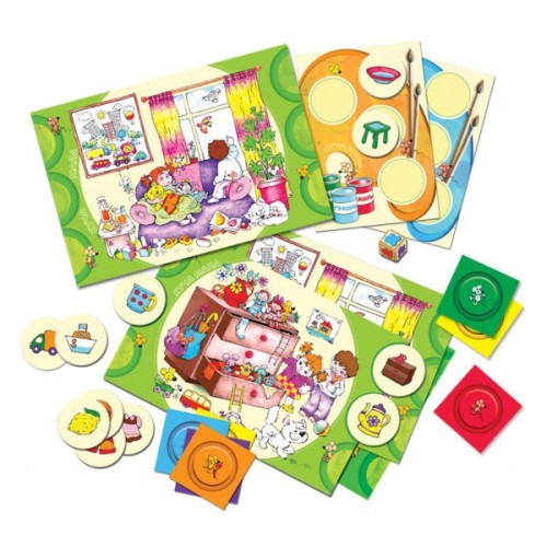 В наборе: 9 карточек-палитр, 6 сюжетных картинок, 6 цветных квадратов и 36 маленьких карточек, игральный кубик с наклейками и инструкция с правилами на 4 игры.