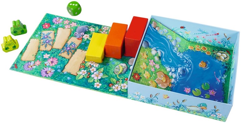 Правила очень просты: 2 игрока по очереди бросают кубик (на нем 2 грани с 1 точкой, 2 с двумя, 2 с тремя). Лягушки прыгают по дощечкам на выпавшее кол-во точек. Кто первый допрыгал до водоема - победил. Для более продвинутых в математике пользователей можно взять еще один такой кубик и тренироваться в сложении или вместо 2 взять 1 "взрослый" кубик с гранями от 1 до 6 точек.