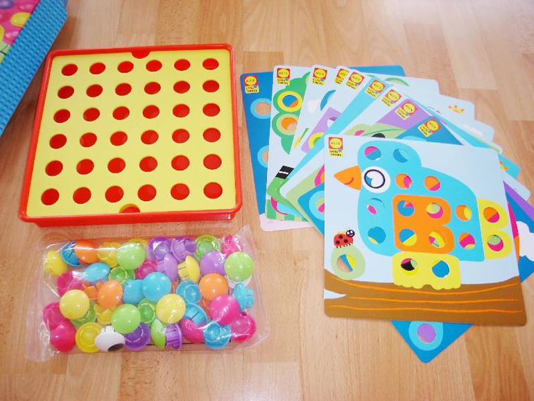 Мозаика классная, у нас похожая от кверчетти, тоже после старшей младшей досталась в отличном состоянии, коробка только поистрепалась, пуговичкам , шаблонам и основе ничего не сделалось :)
