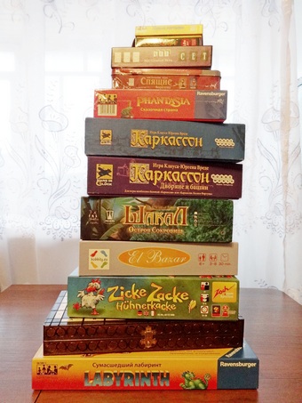 На фото нет Сырных лазеек, их дали поиграть племяннице. Нет коробки от дополнения к Каменному веку (Роскошь каменного века), т.к. база и дополнение в одной коробке. И еще есть пара-тройка самодельных, их не стала фотографировать. И естественно игры, которые у нас появились в 2017-м тоже не ставила )).